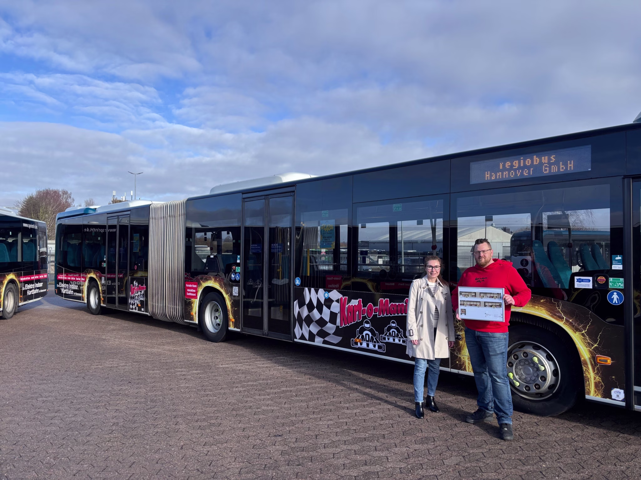 Ein besonderer Moment war die offizielle Übergabe der beiden Gelenkbusse, bei der die Projektpartner persönlich zusammenkamen. Kart-o-Mania-Inhaber Herr Säumenicht und Veronika Kirchhoff aus dem Medienverkauf der HTM Hanse Traffic Media GmbH begleiteten den Start der neuen Verkehrsmittelwerbung und freuten sich gemeinsam über das sichtbare Ergebnis der Zusammenarbeit.