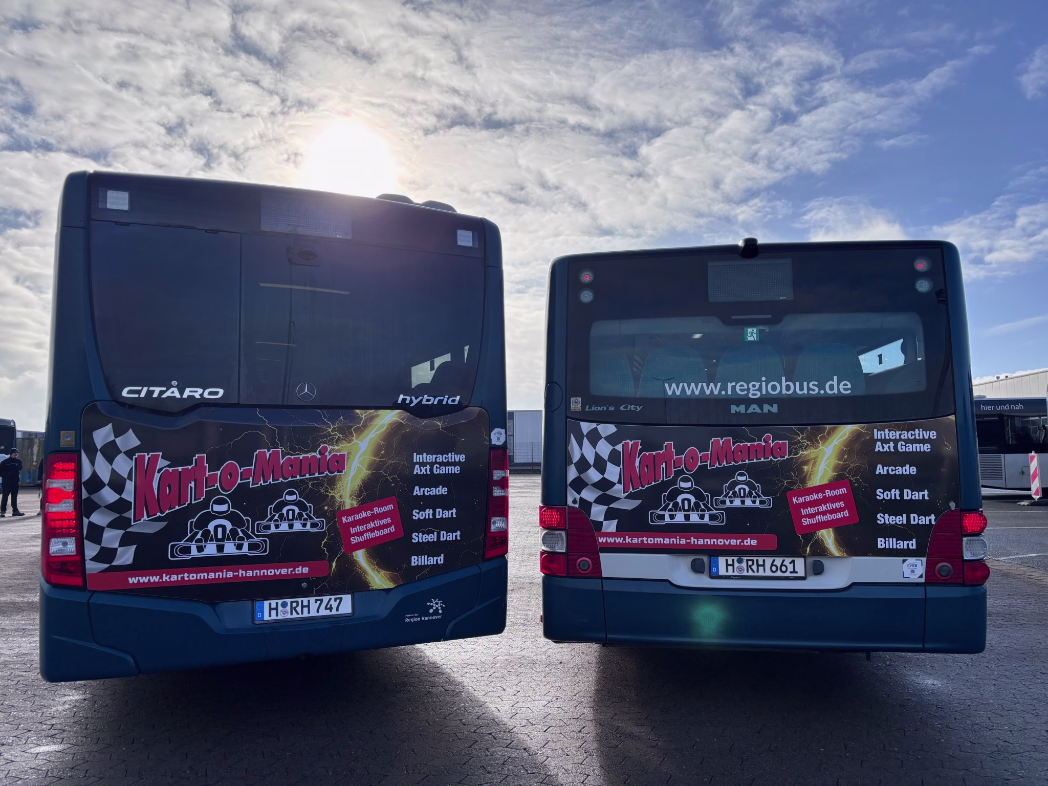 Wenn zwei auffällig gestaltete Gelenkbusse durch die Region rollen, bringen sie nicht nur Menschen von A nach B – sie transportieren auch echtes Rennfeeling. Gemeinsam mit unserem SD-Team setzt Kart-o-Mania auf starke, regionale Imagewerbung und bringt den Adrenalin-Faktor der Standorte in Laatzen und Hannover direkt auf die Straßen. Die großflächigen Motive sorgen täglich für Aufmerksamkeit im Stadtbild und machen Lust auf Geschwindigkeit, Kurven und unvergessliche Erlebnisse auf der Strecke.